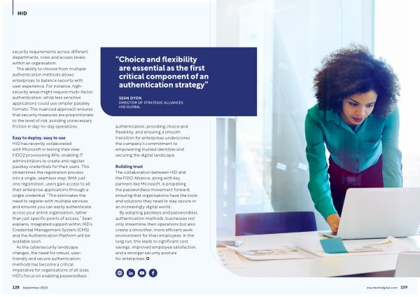 Easy to deploy , easy to use HID has recently collaborated with Microsoft in testing their new FIDO2 provisioning APIs , enabling IT administrators to create and register passkey credentials for their users . This streamlines the registration process into a single , seamless step . With just one registration , users gain access to all their enterprise applications through a single credential . “ This eliminates the need to register with multiple services and ensures you can easily authenticate across your entire organisation , rather than just specific points of access ,” Sean explains . Integrated support within HID ’ s Credential Management System ( CMS ) and the Authentication Platform will be available soon .