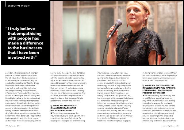 providers which are in a much stronger position to deliver insurtech and offer the full value chain . It is the experience of the industry and understanding the needs of insurers that confidently drives innovation . Tech-wise , a prominent insurtech evolution will be fuelled by abilities provided by a modern cloud infrastructure . The cloud offers insurers a wealth of advantages , with efficiency and flexibility being top of the list . In the cloud , insurers benefit from significant process optimisation , the ability to deliver a better , more customised customer experience , access to future innovation , the ability to rapidly react and adapt and much more , all of which have a positive impact on their bottom line when done well . The potential for insurers to thrive in the cloud is great and we hope more will be focusing on how best to make the leap . The cloud enables collaboration , which presents insurtechs with the opportunity to be supported by larger , established software providers and expand their reach while delivering insurers more convenient access to features via their core system . AI is also becoming a prominent power for insurtech , ushering in a new era of data-driven insurance . And of course , insurance companies have a wealth of data at their doorstep . What a great time to unleash data potential .