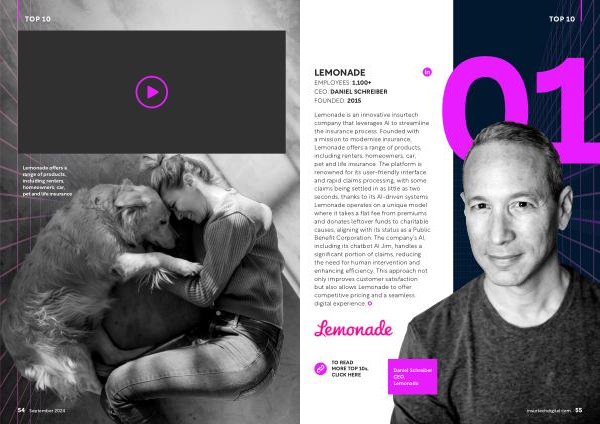 Lemonade is an innovative insurtech company that leverages AI to streamline the insurance process . Founded with a mission to modernise insurance , Lemonade offers a range of products , including renters , homeowners , car , pet and life insurance . The platform is renowned for its user-friendly interface and rapid claims processing , with some claims being settled in as little as two seconds , thanks to its AI-driven systems . Lemonade operates on a unique model where it takes a flat fee from premiums and donates leftover funds to charitable causes , aligning with its status as a Public Benefit Corporation . The company ’ s AI , including its chatbot AI Jim , handles a significant portion of claims , reducing the need for human intervention and enhancing efficiency . This approach not only improves customer satisfaction but also allows Lemonade to offer competitive pricing and a seamless digital experience .