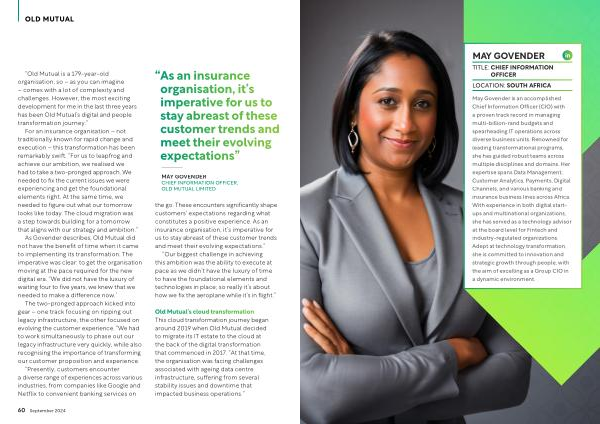 May Govender is an accomplished Chief Information Officer ( CIO ) with a proven track record in managing multi-billion-rand budgets and spearheading IT operations across diverse business units . Renowned for leading transformational programs , she has guided robust teams across multiple disciplines and domains . Her expertise spans Data Management , Customer Analytics , Payments , Digital Channels , and various banking and insurance business lines across Africa . With experience in both digital startups and multinational organizations , she has served as a technology advisor at the board level for Fintech and industry-regulated organizations . Adept at technology transformation , she is committed to innovation and strategic growth through people , with the aim of excelling as a Group CIO in a dynamic environment .