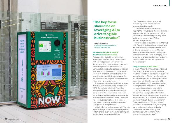 “ For the next 12 to 18 months , we will continue our digital transformation journey , with a strong emphasis on driving improvements in customer and advisor journeys through digital enablement ,” Govender highlights . “ We also aim to accelerate our AI ambition by leveraging our investments in cloud and data capabilities , fostered through our partnerships with Tamr and AWS , to enable our data strategy .”