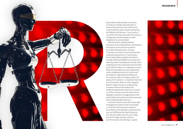 James Harrison , Global Head of Insurance at Dun & Bradstreet , emphasises the impact of insurtech innovations on underwriting practices . He says : “ Insurtech innovations have transformed underwriting practices in recent years . Some particularly valuable innovations include artificial intelligence and machine learning , which have played a critical role in enabling real-time risk assessment and the automation of decision-making processes . Behavioural analytics are also supremely useful , enabling insurers to collect realtime data on organisational behaviour . For instance , they can analyse cyber risk exposure for banks or companies that hold a lot of sensitive data , monitor shipping data for cargo insurance underwriting , or assess financial risk analysis . By understanding these behaviours , insurers can offer more precise risk assessments , leading to tailored coverage options and potentially lower premiums for businesses demonstrating safer practices .”