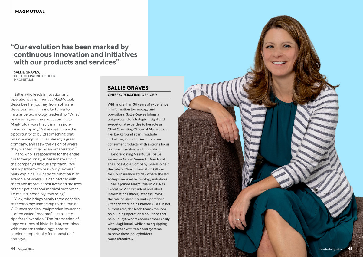 Sallie, who leads innovation and operational alignment at MagMutual, describes her journey from software development in manufacturing to insurance technology leadership.“ What really intrigued me about coming to MagMutual was that it is a missionbased company,” Sallie says.“ I saw the opportunity to build something that was meaningful. It was already a great company, and I saw the vision of where they wanted to go as an organisation.”