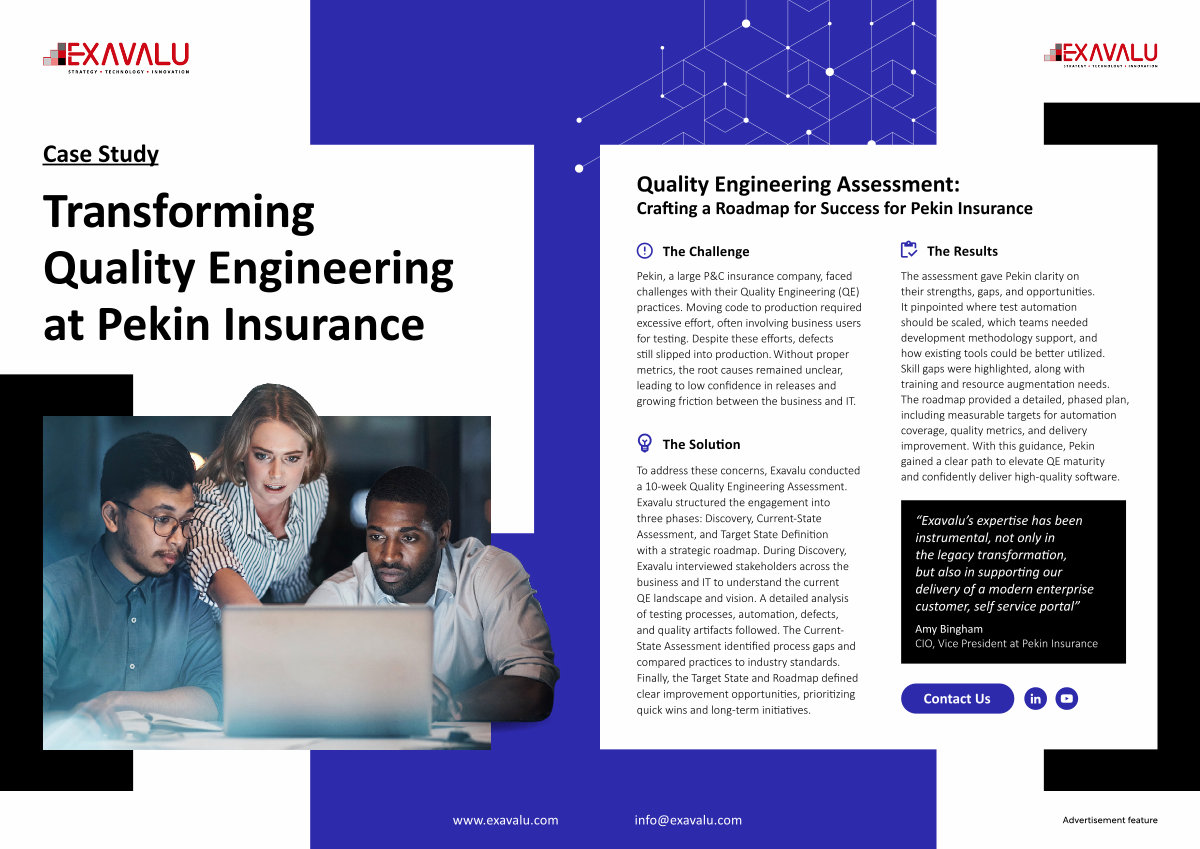 Pekin, a large P & C insurance company, faced challenges with their Quality Engineering( QE) practices. Moving code to production required excessive effort, often involving business users for testing. Despite these efforts, defects still slipped into production. Without proper metrics, the root causes remained unclear, leading to low confidence in releases and growing friction between the business and IT.