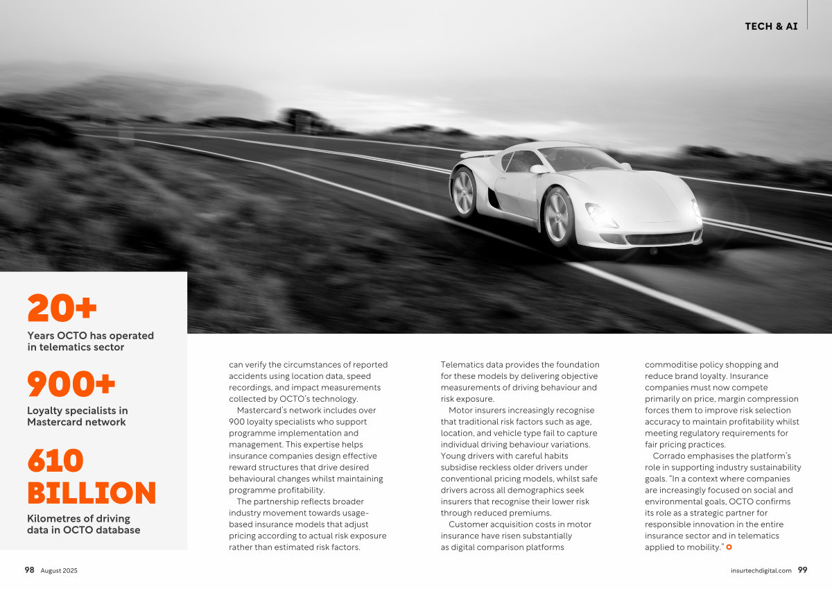 Corrado emphasises the platform’ s role in supporting industry sustainability goals.“ In a context where companies are increasingly focused on social and environmental goals, OCTO confirms its role as a strategic partner for responsible innovation in the entire insurance sector and in telematics applied to mobility.” insurtechdigital. com 99