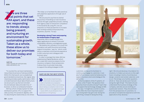 Ho says : “ It might be a cliché to some , but to AXA , the most important aspect of a strong team has got to be ‘ doing the right thing , instead of doing the thing right ’. We should develop a foundation for solutions , to make sure we are on the right track , including in terms of architecture design , solution and vendor selection , and so on . This brings out a further question , which is : ‘ How can we be sure if we are doing the right thing ?’. The team should understand the business strategy of the company , and why we are working on a particular solution . They should think from the perspective of customers , to provide an exceptional experience with the applications they develop . “