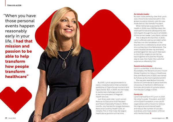 Awards and accolades Lynch is a member of the Business Roundtable , the World Economic Forum Global Coalition for Value in Healthcare Executive Board , and , in 2022 , was named by Fortune as the most inspirational CEO . She was also awarded an honorary Doctor of Commercial Science from the University of Hartford in 2022 and an honorary doctorate of humane letters from Becker College in 2015 .
