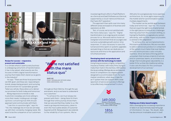 Developing stand-out products and services with the technology to match Hong Kong possesses a highly competitive insurance market , with many firms trying to make their mark in the territory . AXA tackles this by providing offerings above and beyond those of competitors via a digital system designed to accommodate them . For such market conditions , what does it take for an IT system that can support AXA ’ s wide spectrum of service and product offerings to be effectively implemented ? In short ,