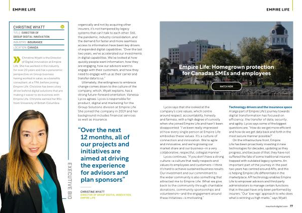 On the infrastructure front , Empire Life has been proactively investing in new technologies for decades , updating as they progress , and because of that , they have not suffered the fate of some traditional insurers trapped with outdated legacy systems . An important part of the journey in the past two years has centred around APIs , and this is helping Empire Life differentiate in the marketplace . API technology enables Empire Life to empower advisors and third party administrators to manage certain functions that in the past have only been performed by insurers . “ Our ‘ low-ego ’ approach to who does what is winning us high marks ,” says Wyatt .