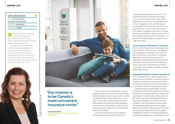 Dara Brachman , Vice President of Group Distribution within the Group Solutions division at Empire Life , has been with the company for seven years . For the first five of those , she led the various teams as Vice President of Group Operations . She says , “ Our mission is to be Canada ' s most convenient insurance carrier . Our distribution partners and our strategic partners have told us that success is a function not only of our investment in various digital capabilities but also of our flexibility and the way that we engage in a customised manner .