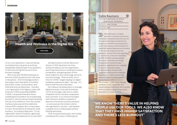 Callie Baumann is a digital executive , consumer experience enthusiast , and passionate advocate for the ways technology and experience design can transform businesses ( and lives ). Callie serves as Vice President of Digital Workplace Experience at Humana . In her decade-long tenure at the company , she has held roles spanning IT , operations , consumer innovation and HR . Whether quarterbacking the move to remote work during the pandemic , transforming a grievance department into a leading source of consumer insights , or advocating for intentionally designed consumer and employee experiences - Callie is passionate about bringing humanity back to the workplace . Callie is mum to four children – Lydia , Piper , Georgia and Rome . In her spare time , she enjoys reading , impromptu dance parties with her kiddos , and spending quality time with her husband , Arthur .